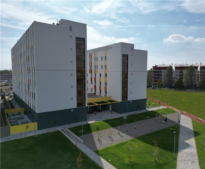 L’edificio per le residenze temporanee è strutturato in due volumi principali, rispettivamente di sei e sette piani, a pochi minuti dalla stazione ferroviaria e a soli 2km dall’Università.